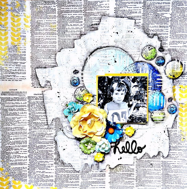 Pour réaliser cette page, je me suis servi de l'un des stencils Faber Castell et de la pâte texturante pour faire mon fond. J'ai ensuite coloré les contours avec un crayon fusain et de l'encre Distress jaune. J'ai utilisé l'envers des papiers Kaisercraft pour mater ma page. J'ai un pigé dans mes réserves personnelles pour compléter ma page avec quelques embellissements jaunes.